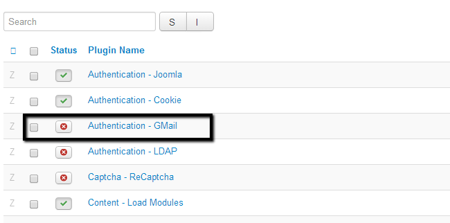 Find the plugin that you would like to enable/disable on your website and click on it’s name. For the purpose of this tutorial, we will use the Authentication - Gmail plugin
