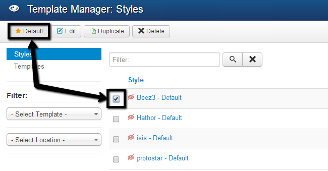 Select a template through the check-box next to it and click on the Default button at the top to make it the default on your website.