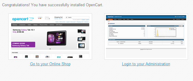 Congratulations, you have successfully completed your OpenCart installation process and you can access your store frontend or the OpenCart admin panel via the links provided on the final page of the installation process.