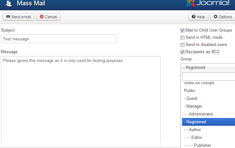 - Mail to Child User Groups - Enable this options if you wish to mass mail the selected user group and all of it's subgroups.