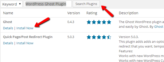Input the WordPress Ghost Plugin name into the Search field and install the Ghost plugin.