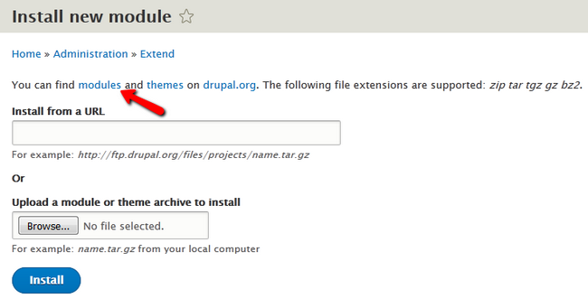 You can upload the archive via the Browse... button or just copy and paste the link to it in Drupal and click on the Install button to continue.