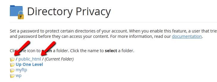 You will be redirected to the Directory Privacy page where you can see the directory tree of your hosting account. To expand a folder click on the yellow folder icon. If you would like to password protect the directory, click on the directory name.