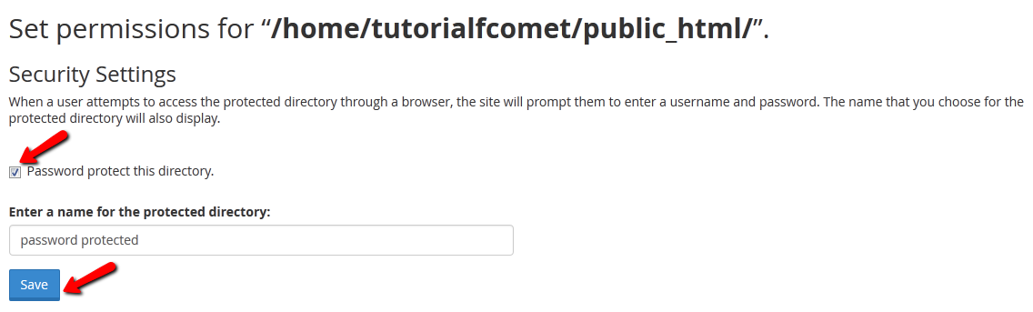 To activate the password protection on the directory click on the check box "Password protect this directory" and input a short message that will be displayed just above the login box when someone access this folder.