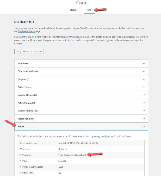 When on the page, click on Info and then on the Server tab to see the system information your website is using, including the PHP version.
