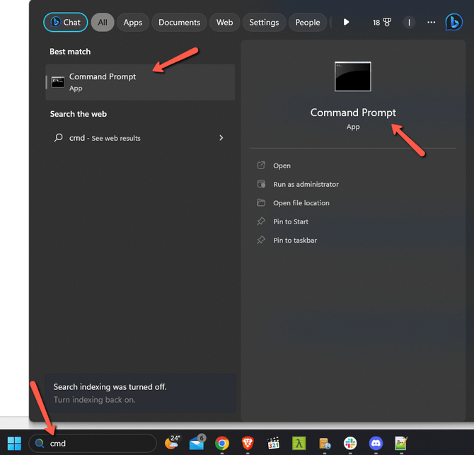 To perform a ping test in Windows 11 you have to first find the command line. Type cmd in the search bar in your task bar, or in the search bar of your start menu. You will see the Command Prompt tool appear.