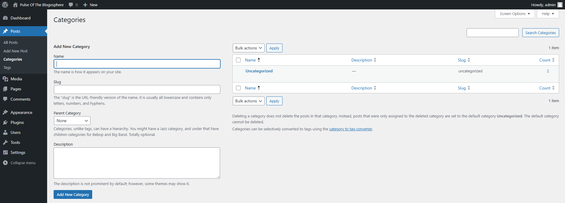 Firstly, the Categories section will allow you to create–as the name suggests–categories for your posts. That in itself is immensely valuable as a functionality because it will enable you to easily and efficiently organize your posts. You can also assign a slug (https:example.com/this-is-the-slug) for your category that will allow users to view all posts under that category. If you want to create a subcategory, you can assign a parent. Finally, depending on their setup, you can also assign a description to the category that some themes might show. The table on the right side of the page shows the currently existing categories with their descriptions, slugs, and the number of posts within that category.