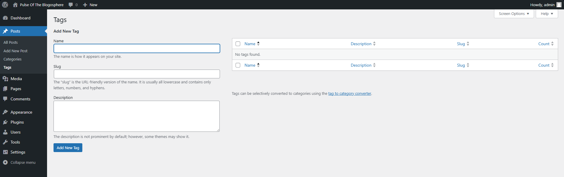 The last part of the Posts section is Tags. Similar to Categories, Tags allow admins to add specific tags (short phrases or keywords) to their posts, enabling them and users to search or filter according to those particular tags. For example, a post about clothes would likely have tags such as clothes, fashion, brand, etc. When users search for a specific tag in your website's posts, they will see the ones marked with it.