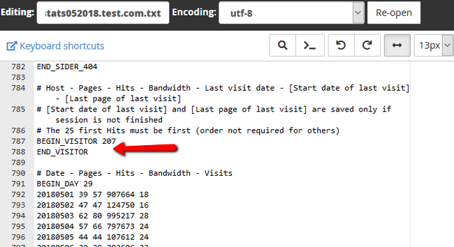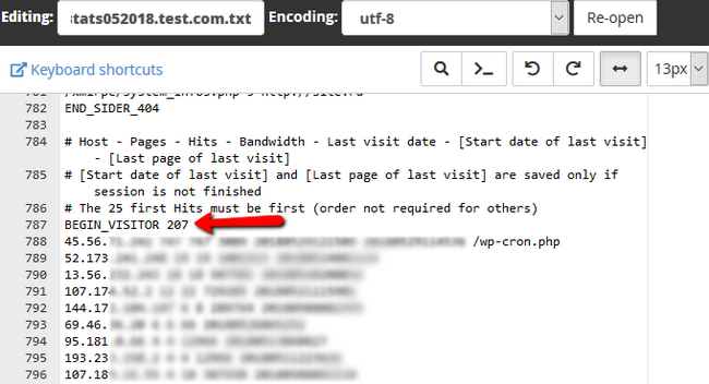In the file editor, you can use Ctr+F to search for "BEGIN_VISITOR". This is the start of the IP address list, and there will be all of the IP addresses that have accessed that domain.