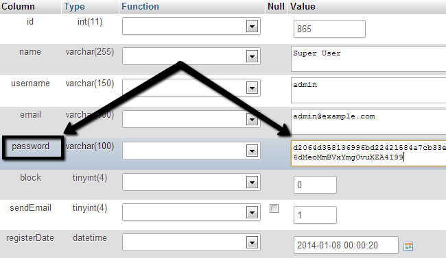 Now, the next step will actually change the password for the admin user on your website. The important thing to know here is that the password is encrypted. This means that it will not be a human-readable password, but a string of symbols, which represents your password, using complex encryption algorithms.