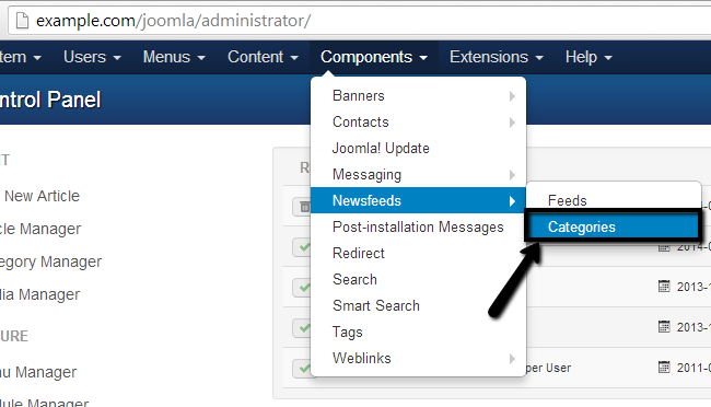 This step is optional and it is intended for those who have not created any newsfeed categories yet. To do that, log into your website as administrator, go to the Components tab and then Newsfeeds > Categories.