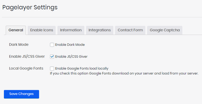 - General - You can enable dark mode and JS/CSS Giver from here, and also have Google Fonts download and load from your hosting server instead of from your website;