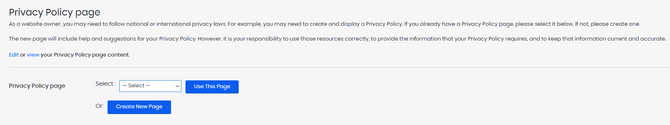In the Privacy settings page, you can select the page you want to use for your privacy policy page. You can create a page directly from this menu if you don’t have one. A privacy policy page is good because some international laws require websites to have it. As a general rule of thumb, having one is always good.