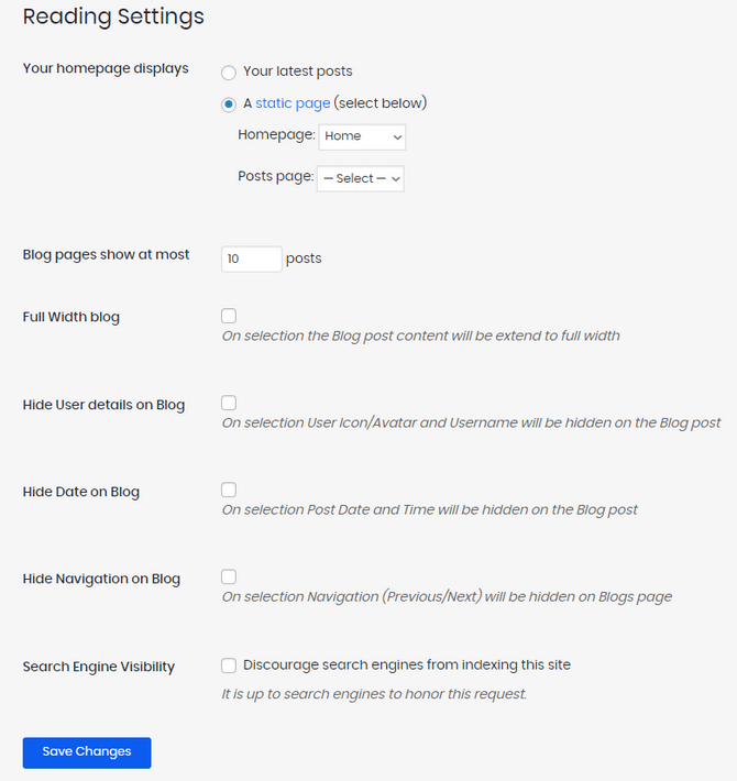 - Homepage displays - You can choose the home page to display your latest blog posts or a custom static page;