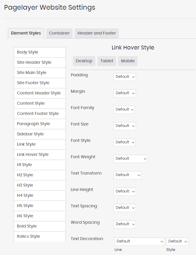 - Element Styles - You can set how various elements of your website (headings, footers, headers, etc.) appear. You can select specific font styles, margins, line values, and so on. That will change how the typography of these elements looks;