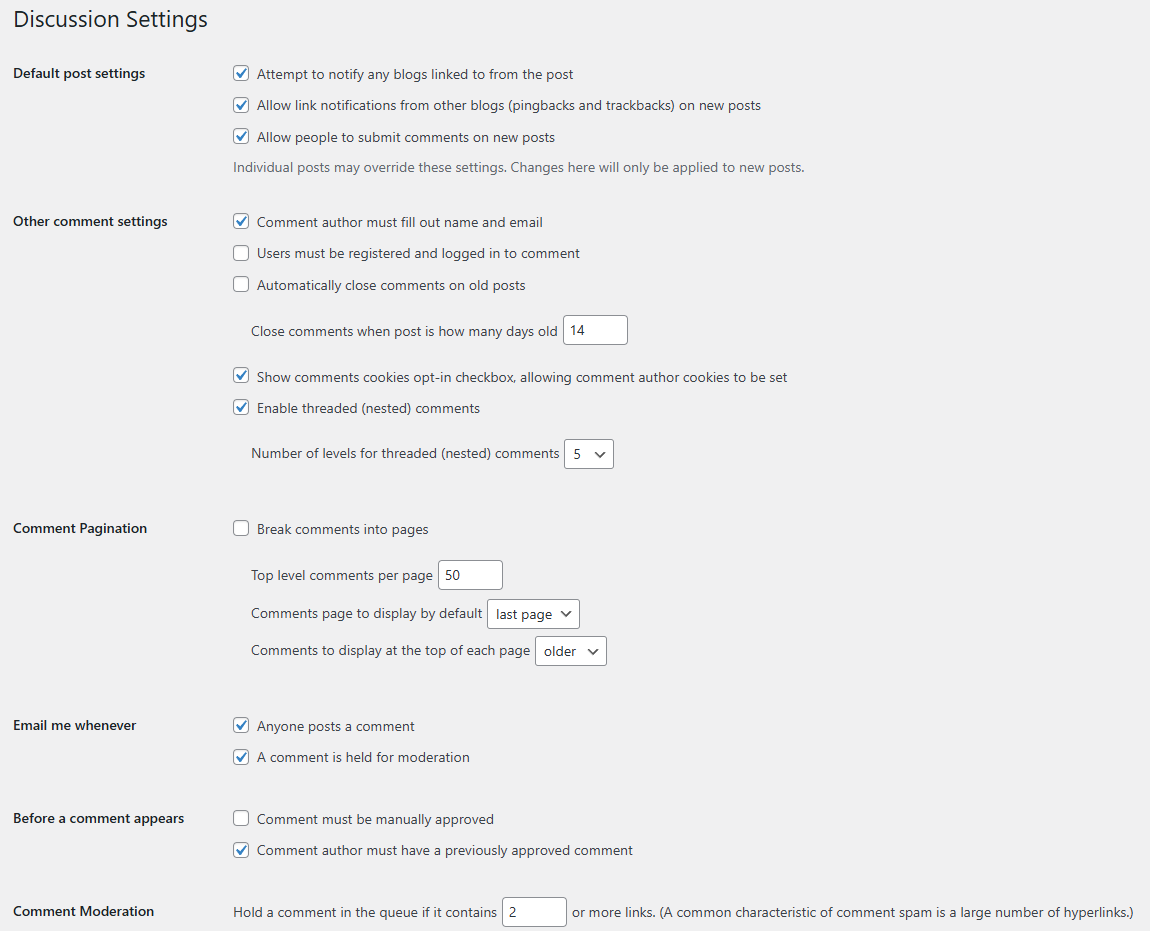 Next in the Settings section of the WordPress dashboard is the Discussion page. It primarily revolves around comments on your posts and how they are moderated and behave. This is an essential page for any website that allows comments on its posts, so ensure it is set up correctly. Here is a breakdown of what each individual option does.
