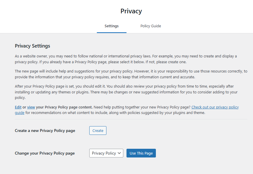 In this part of the Settings section, you will find two tabs. The first is where you choose to create or use an existing page as your privacy page. The second tab, Policy Guide, is where you will find extensive guidelines for a solid privacy page. Make sure you read through it if you are uncertain about what is necessary and what is not.