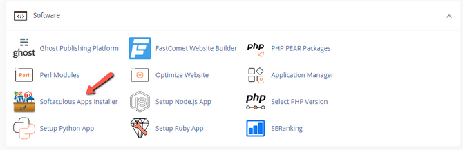 To begin, log into your cPanel account and head to the Software section where you will find the Softaculous Apps Installer. Check our tutorial on the installer for more in-depth information and to learn more about using it.