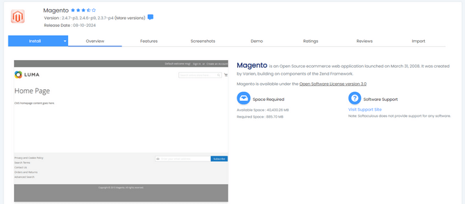 Since this is a tutorial about installing Magento, we will focus on the Install tab. You might have noticed there is an arrow next to it. That opens a small drop-down menu which offers you a choice between Quick Install and Custom Install. We will focus on the Custom Install since it is the exact same as the Quick Install but with more customization options. It is also what Softaculous defaults to when you click Install, instead of choosing from the drop-down.