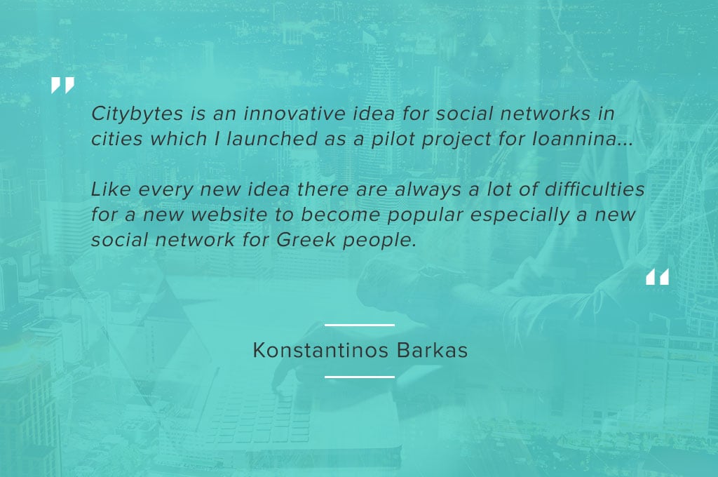 Konstantinos Barkas: Citybytes is an innovative idea for social networks in cities which I launched as a pilot project for Ioannina. Members can make new friends within their city, join groups or join the forum and start new and interesting topics. Members have the ability to send their private or public messages to other members but that is not all. One of the unique features in this social network is the flirt feature which allows members can flirt with each other. Other cool features of the social network are the “classified” and “pets” that every member can see or create. Furthermore, the application itself seeks feeds about everything in the city and presents these feeds to the members (news from your city or villages nearby, upcoming events, news from local universities etc)