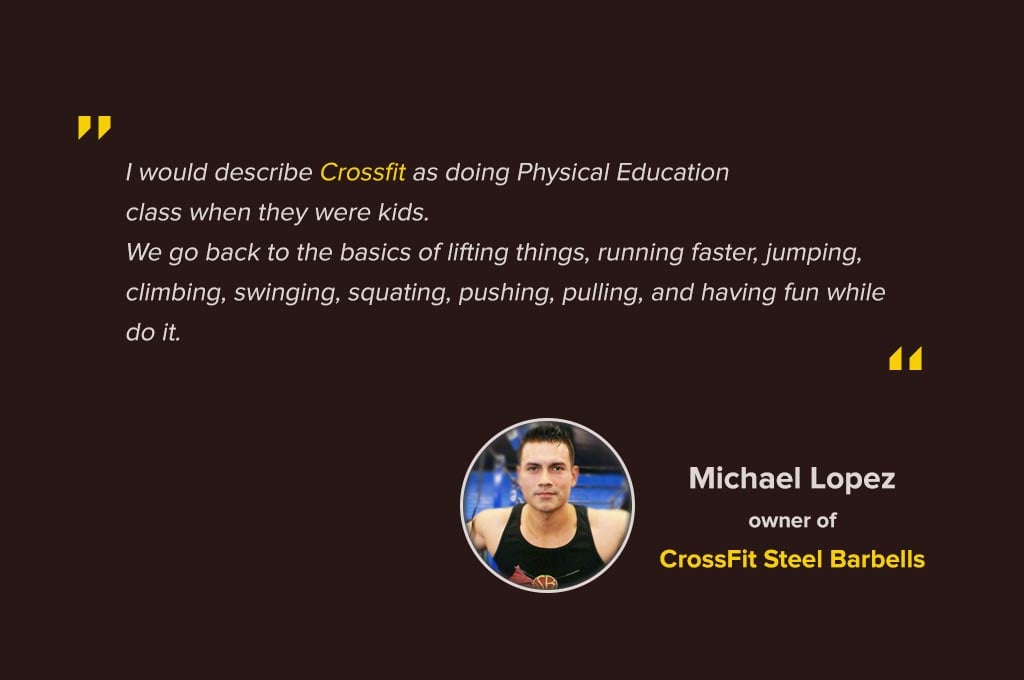 Michael: I would describe CrossFit as doing Physical Education class when they were kids. We go back to the basics of lifting things, running faster, jumping, climbing, swinging, squatting, pushing, pulling, and having fun while doing it.