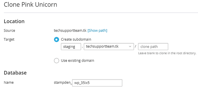 A page will appear on the left side of the screen, where you can choose where you want the website to be cloned and what the database's name should be.