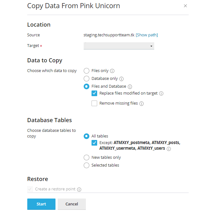 At the top, you see Location, where you have to select the live website to which you wish to push your changes. Below Location is the Data to Copy field, and here you can choose what gets pushed to the live website. You can push only the files or database, or both! You can also decide if the process should replace any files which are present on both the live and staging websites. That is important to understand. Ticking Replace files modified on target will replace files modified on the target with files from the source, even if the source files are older.
