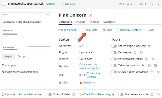 Creating a staging website is only half of the process, though! The changes you make to your staging website won't automatically push themselves to your live website. Fortunately, the WP Toolkit can help with that as well! The Copy Data button is what you are looking for, and when you click it, several options will appear on the left.