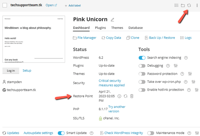 Sometimes pushing changes to live does not go according to plan, which can be very frustrating if you don't have a backup available. Fortunately, the WP Toolkit is prepared for that as well. If you have used its Copy Data functionality to push changes from your staging website to live, you likely created a restore point before you began the pushing process. It is a tick box, which you can select before starting. If you have created one, you should see a restore point in the website's dashboard within the WP Toolkit. If you can't but are sure you have ticked the restore point during the pushing process, then please use the Refresh button in the top right corner of the website’s dashboard.