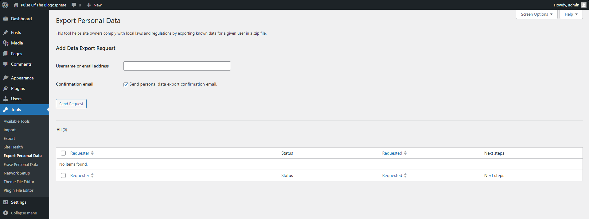 As you can see, each email contains a link that users must click to continue with their request. Once they click the link, the administrator will see their confirmation in the table at the bottom of the page, as you can see in the screenshot above. That unlocks the option to either erase the user’s personal data or send it to them as a .zip file.