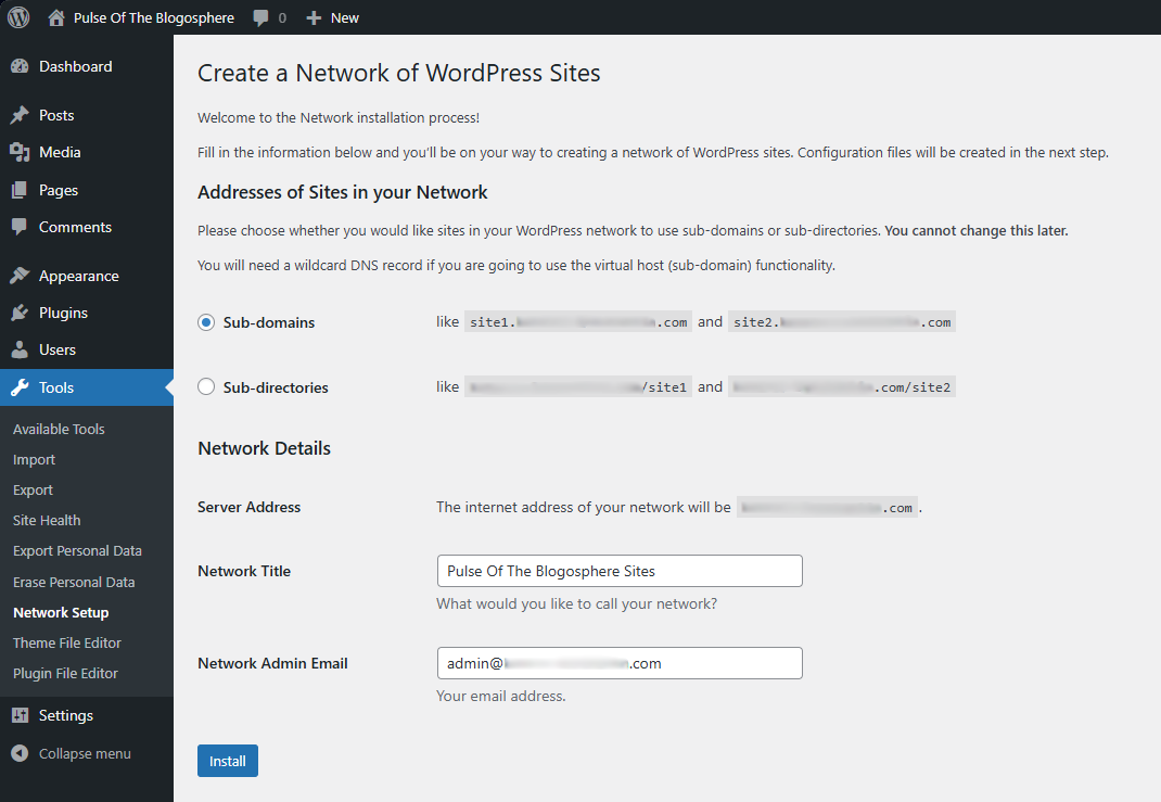If the line already exists, ensure that the value is set to true. Once that is done, you can go back to your WordPress dashboard, configure the multisite network, and then install it. We recommend using subdomains for a more efficient website structure.