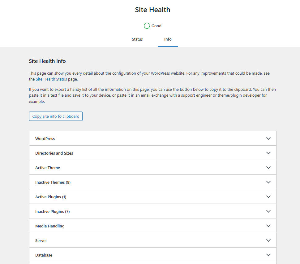 This screen is purely for information, which is immensely useful. It is a singular, consolidated place where you can look up almost anything you could ever need about your WordPress configuration and the server your site is on.