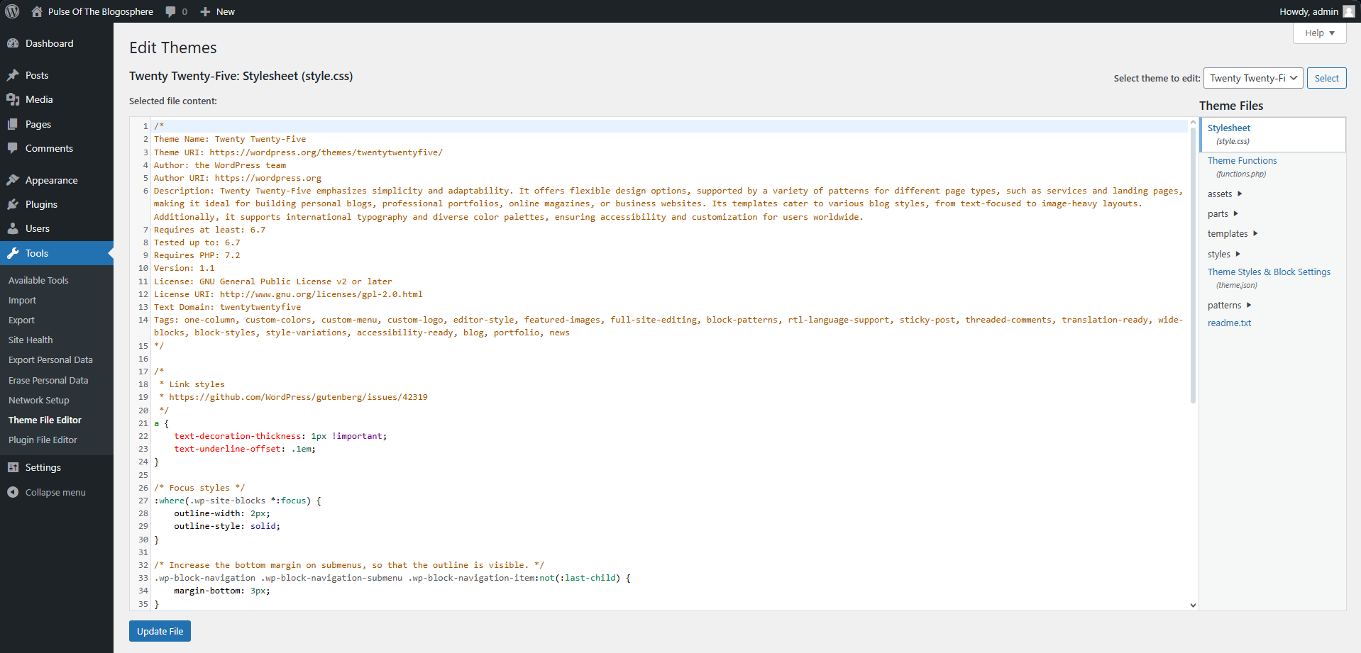 These pages allow you to directly edit the files of your themes or plugins and change the code as you require. However, if you are not familiar with how themes or plugins are coded or are not certain how to edit the code itself, we recommend not changing anything here. Saving the wrong piece of code might break the theme or plugin, which can cause instability or issues for your website.