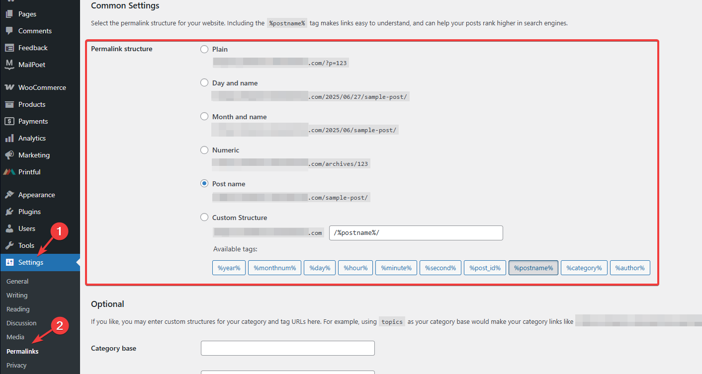 Next, navigate to WordPress Settings > Permalinks. There, ensure that the permalink structure is anything except Plain. That will ensure the REST API endpoints work properly.