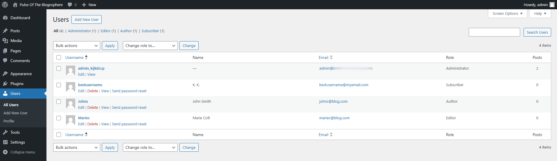 Like with everything else about WordPress, managing the users is exceptionally straightforward. The interface is intuitive, and the options are clear. The space on the page is taken up primarily by a table showing all users. The table itself can be customized via the Screen Options at the top. You can enable or disable these columns: email, role, and posts. You can also change the number of users per page in the table.
