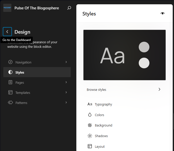 The first element we will take a look at are the Global Styles. As the name suggests these styles affect your entire website. They were introduced in version 5.9 and have seen significant updates since then. Users can use these styles to create a design that will apply throughout the site. It is a great way to ensure stylistic consistency throughout your site’s pages. The best part is that this can be accomplished entirely through the Full Site Editor interface itself; no additional coding required!