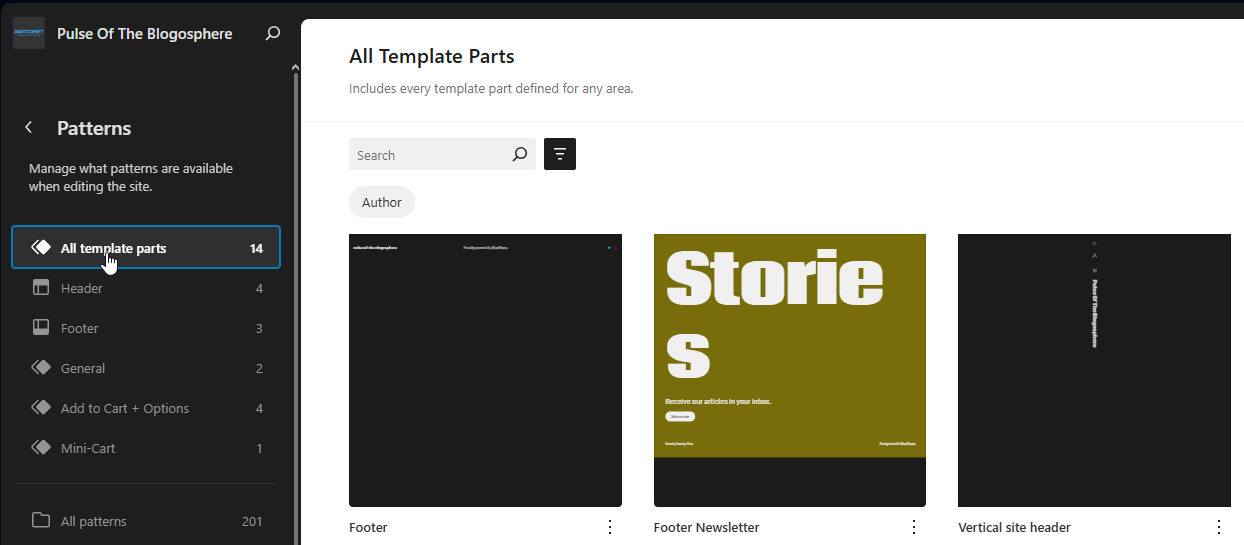 The final major element of the Full Site Editor we will discuss is similar to Patterns. Template Parts are also block collections, however, unlike Patterns, these ones are for structural elements in a Template. Headers, footers, sidebars, for example.