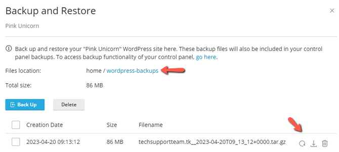 You will see the directory where the backups are stored. Click on Back Up, and the generation process will begin. Depending on your website's size, it might take a few minutes. When completed, you will see the newly generated backup. You also have three options on what to do with it: restore your website, download the backup, or delete the backup.