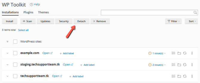 If at any point you do not wish your WordPress website to be managed by the WP Toolkit, then you can use the Detach button to remove it.