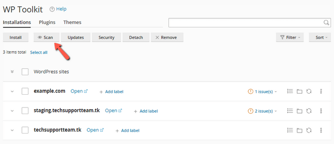 The WP Toolkit will automatically add any WordPress websites installed through it to its dashboard. If a website was added to your hosting plan differently, though – such as manually installing WordPress or moving the website, then the WP Toolkit will not automatically detect it and add it to its list. That is why the Scan button exists.