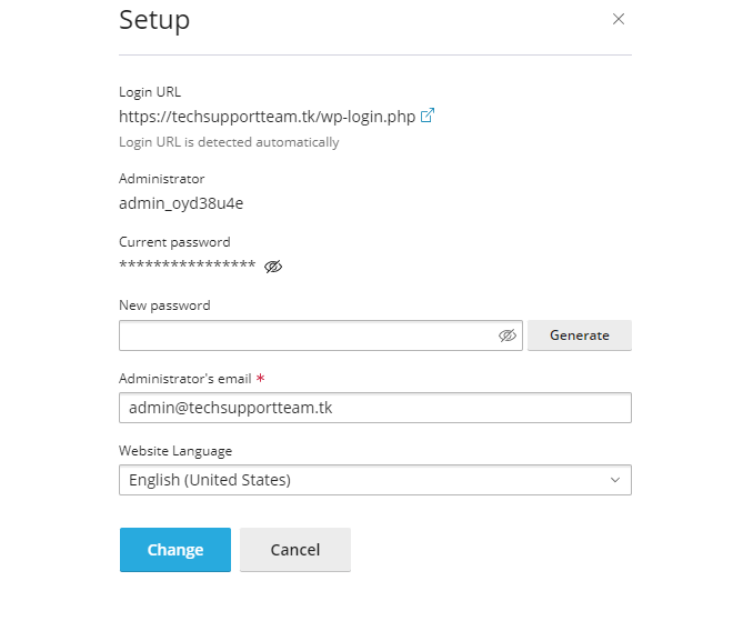 You will see your website’s URL and admin user, and you can click on the eye icon next to the password to reveal it. That is a straightforward way to recover your administrative password. If you would like to change it, you can also do that from this screen. Type in the new password you wish to use (or use the generator) and click Change. The same goes for the admin email and the website's language. The WP Toolkit can put an end to forgotten passwords with ease!