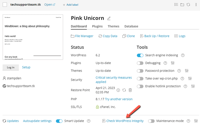 The WP Toolkit can check the integrity of the WordPress core files. That is a handy feature if you suspect something is not quite right with your website's core files. You can start the verification from the Check WordPress Integrity button.