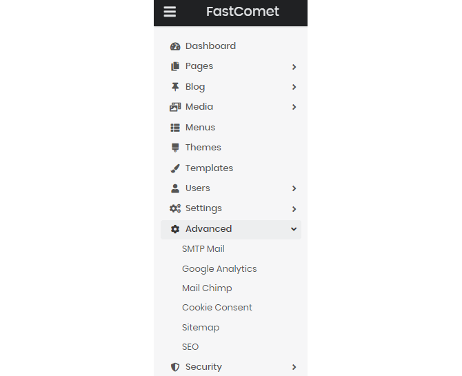 The Advanced Settings tab offers settings related to SEO and emails. From here, you can control how your website sends emails, manage your sitemap, track your Google Analytics, and more. We will list all options you can change in this part since they are few and easy to explain.