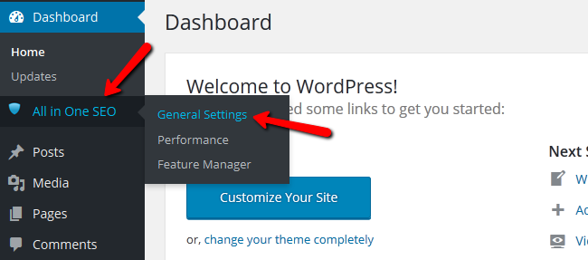 To configure the settings of the newly installed plugin, you will need to click on the All in One SEO→General Settings option.