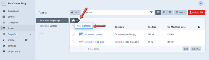Then name your subdirectory, and when you are done, you can select the files you want and use the cogwheel menu to Move your files to it. All that is left is to add your Assets to your Entry Types.
