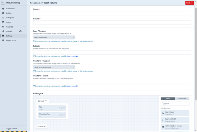 To begin, you have to create an Asset Volume. Typically, the system will create one for you upon installing Craft, but if it didn’t for some reason, or you need to create a new one, here is how you do it. Firstly, go to Settings > Assets, and click on +New Volume. That will take you to the creation page for Asset volumes, so fill in the necessary details as needed.