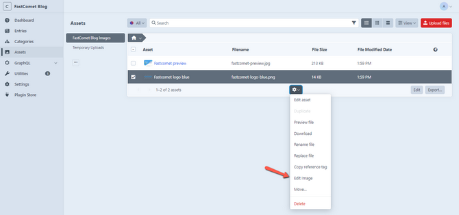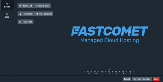 Each Asset can be interacted with within the dashboard by selecting it and then clicking on the cogwheel that appears. The options include typical things such as Preview, Download, Rename, etc., but the one that stands out the most is the ability to edit images.