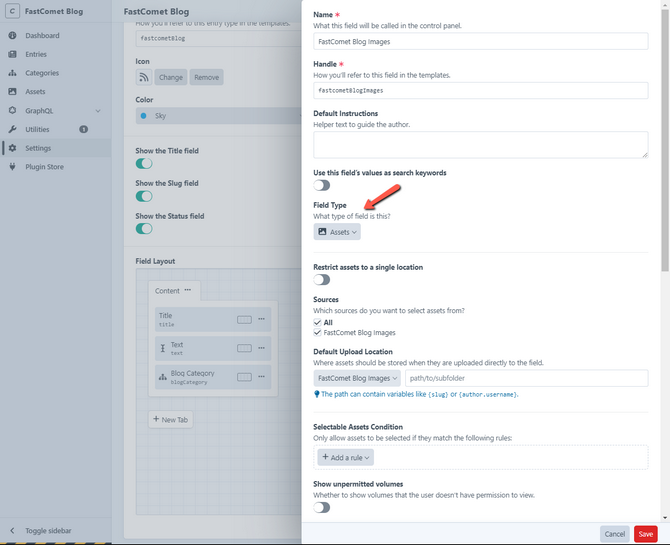 Save your new field and add it to the Entry Type layout. Save your changes, and the next time you create a new Entry for this type, you will see the Assets field, so go ahead and add the image or other file you need.