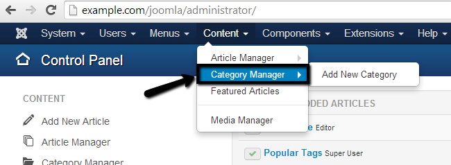 To access the Category Manager, log into your website as administrator, navigate to the Content tab and then Category Manager.