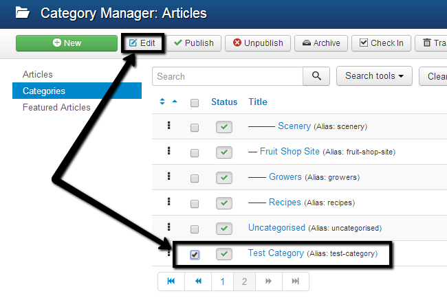 You can also edit already existing categories on your website. To do so, access the Category Manager, select the checkbox next to the category that you wish to edit and click on the Edit button at the top.